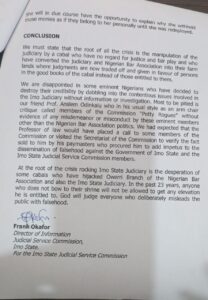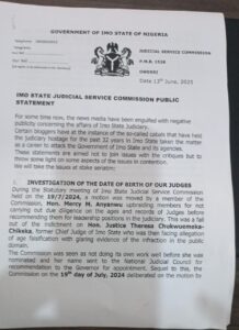Titled “IMO STATE JUDICIAL SERVICE COMMISSION PUBLIC STATEMENT”, the document purports to “throw some light” on the multiple controversies rocking the state’s judiciary. But rather than clarify, it adds fuel to the fire.