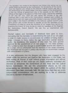 Throughout the statement, the Commission blames a vast conspiracy of “cabals,” “bloggers,” and members of the Nigerian Bar Association, whom it accuses of turning the judiciary into “their farmlands where judgments are now traded off.”
