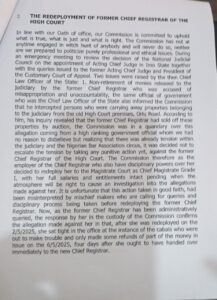 In a segment that raises more questions than it answers, the Commission discusses the redeployment of the former Chief Registrar of the High Court, citing allegations of “misappropriation and unaccountability” and the sale of judiciary property. The allegations—unverified and recounted secondhand from an unnamed “Chief Law Officer of the State”—prompted the Commission to redeploy the Registrar to the Magistracy “with full salaries and entitlements intact.”